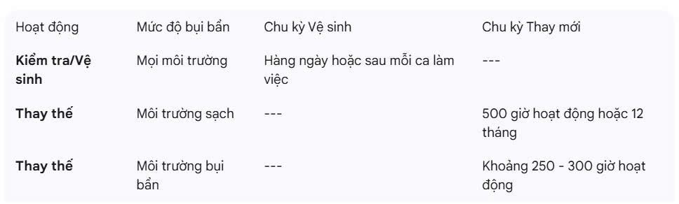 +) Thay thế định kỳ: Lọc gió nên được thay thế định kỳ sau khoảng 500 giờ hoạt động của xe nâng, hoặc tối thiểu là 12 tháng, để đảm bảo động.